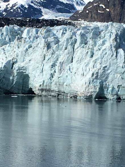 Before coming on the Alaskan cruise, I did a lot of research to determine what to pack. Everything I read talked about dressing in layers. We decided to leave our winter coats home, but bring sweaters, jackets, heavy socks, winter gloves & hats, and rain attire. Overall, the weather was mild and varied between the 50-60°F. There were many comments about the lack of rain during our visit because there is generally lots of rain in May. What I was not prepared for was the Glacier Bay National Park! I was raised in Chicago, so I was familiar with cold weather. However, it was literally freezing in Glacier Bay! The Ruby Princess ships’ log says the temp was 46.4°F, but it felt much colder than that! The layers, gloves, hats, etc. did not allow me to get warm! I could feel the cold to my bones! I have never felt a cold like I did when viewing the glaciers! Following are a some facts and a couple of pics: